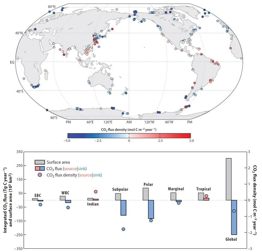 图1. 全球近海单位面积海-气CO2通量新集成(上图);近海不同特征区域海表面积,单位面积碳通量及总碳通量(下图)