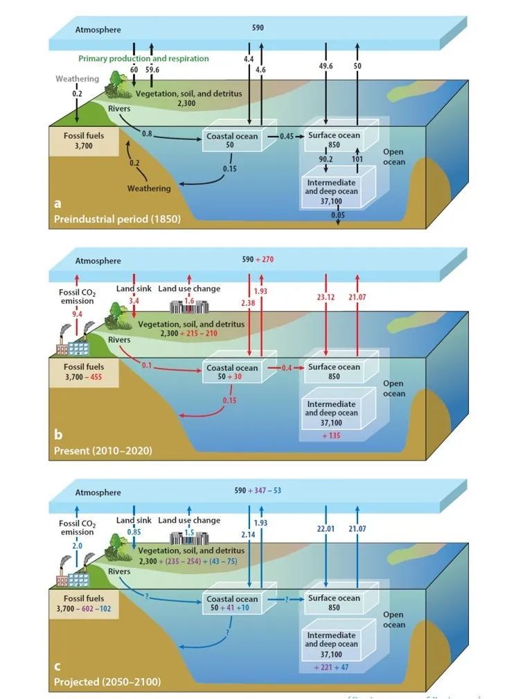 最后,作者系统分析了从工业革命前到现今,再到未来实现碳中和这三个阶段的全球碳循环(包括各碳库储量和碳库之间的碳通量)演变过程。同时提出以净零排放为目标的人为扰动,可从不同界面,对陆-海-气这一耦合、协同变化系统产生影响,这也是预测近海碳循环未来变化趋势的关键挑战。