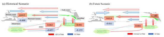 图2 历史情景(a)与未来情景(b)热带太平洋叶绿素对ENSO事件的响应示意图。图中仅显示能引起叶绿素变化的物理过程。数字表示对应过程引起的叶绿素浓度异常变化,单位mg/m3。在未来情景下,CESM-LE模拟的东赤道太平洋上升流地区叶绿素浓度不再对El Niño和中等程度La Niña事件有显著响应。