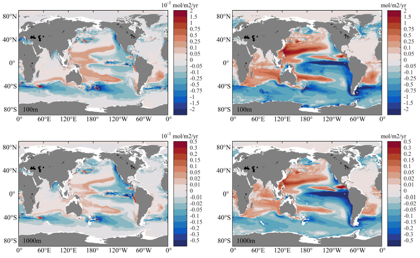 图3敏感性实验与对照实验模拟的100 m和1000 m处POC年通量差异。左侧和右侧分别为TLP在海洋近表层或在海洋底部向海输送时的敏感性实验。