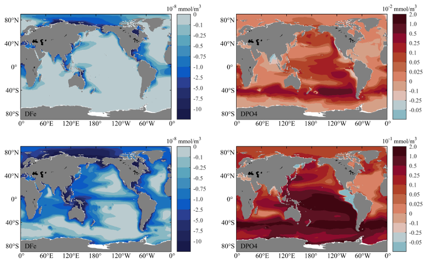 图2 敏感性实验与对照实验模拟的0~100 m的年平均铁(左)和磷酸盐(右)浓度差异。上排和下排分别为TLP在海洋近表层或在海洋底部向海输送时的敏感性实验。