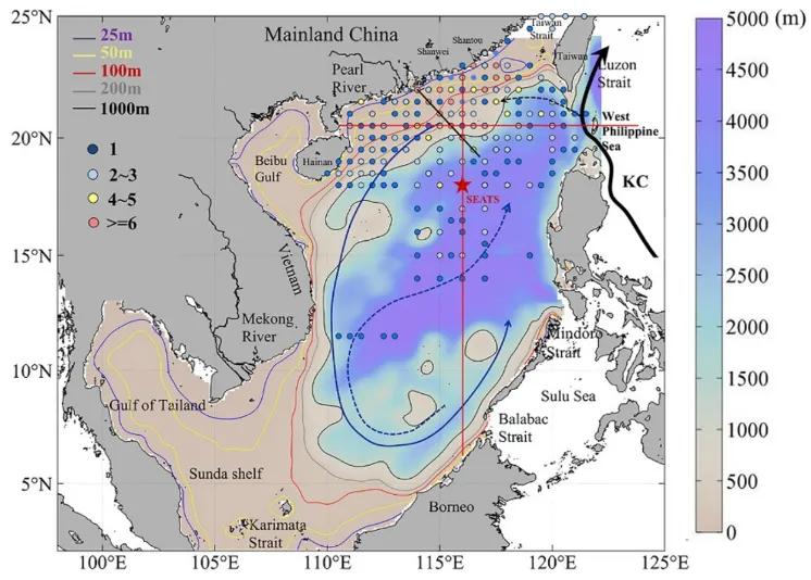 图2 南海地图,调查站位与调查频次(来自第16章)