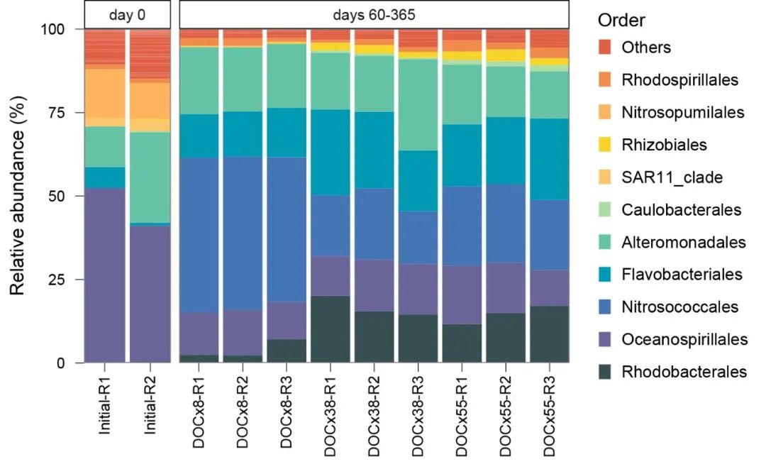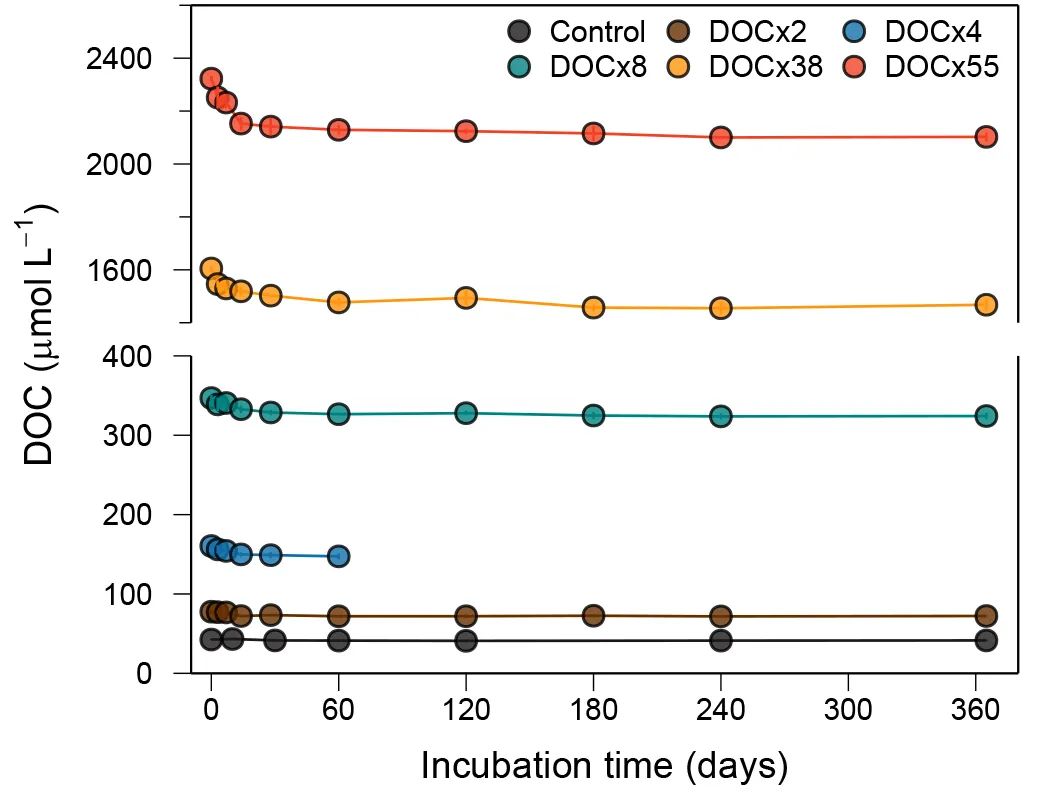为厘清DOC生物可利用性的限度问题,研究团队将培养过程分为两个阶段:前期(0-28天)和中后期(28-365天),发现绝大部分的DOC降解发生在前期阶段,伴随着较高的DOC降解速率(最高6.0 μmol C L-1 d-1)和较快的微生物生长速率(最高0.2 d-1)(图3a和c);而在培养中后期,仅有少量(0-2%)DOC发生降解,且微生物的生长速率趋近于0 d-1(图3b和d)。该差异表明,当DOC发生累积时,仅一小部分在短期内降解,剩余绝大部分将在长时间尺度上抵抗微生物降解。