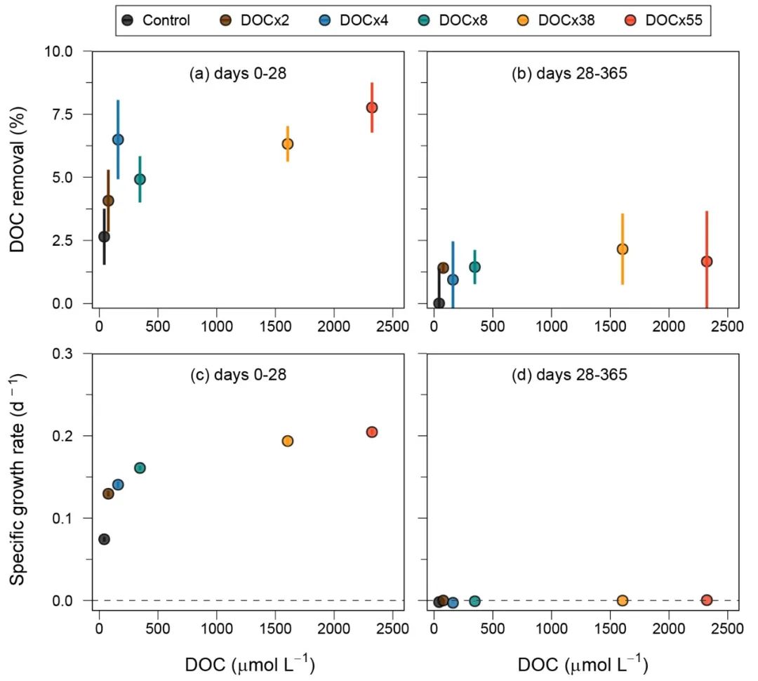 图3. 培养实验前期(0-28天)和中后期(28-365天)的DOC降解百分比(a,b)及微生物生长速率(c,d)
