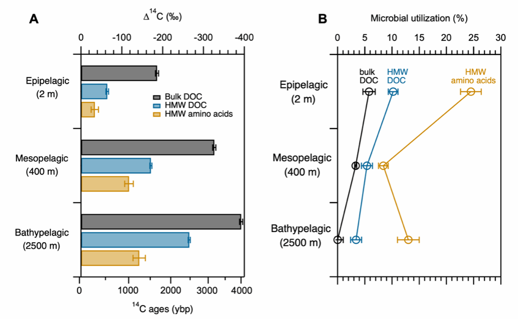 研究团队从总DOC中分别富集了高分子量(HMW;> 2.5 kDa)DOC以及HMW氨基酸组分,发现总DOC与HMW DOC的14C年龄随深度增加而显著老化,深海DOC的14C年龄约为4000年。然而,HMW氨基酸组分14C年龄从中层(940 ± 100 ybp)至深层(1170 ± 140 ybp)却并无显著变化,表明深海DOC库中存在更年轻、富含蛋白类化合物的有机质。