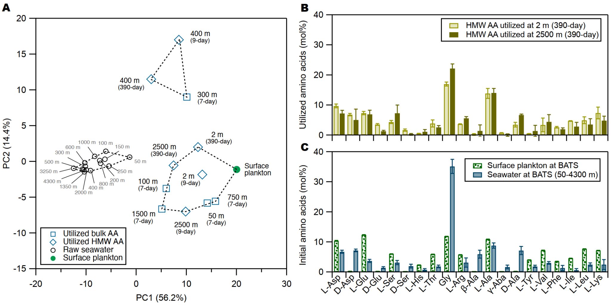 通过微生物降解实验(7-390天),发现总DOC与HMW DOC的微生物可利用性随深度增加显著下降。然而,HMW氨基酸组分在深海中的微生物可利用性却显著高于中层海洋值,且大部分的降解发生在一周内,属于“易降解”类别。这一发现表明,尽管深海DOC碳库整体呈现降解惰性,但其中仍存在一部分不易察觉的、新鲜且易降解的蛋白类有机质,可作为深海微生物的重要能量来源。