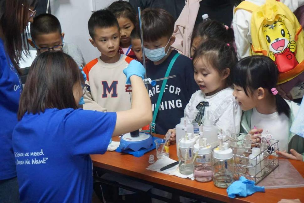 结束理论知识的讲解后,有趣的海洋溶解氧滴定实验演示正式开始。在海洋生物泵过程中,浮游植物不仅利用二氧化碳以起到固碳作用,还在过程中释放氧气。海洋中氧气的含量,对维系海洋生态系统起着重要的作用。“什么是海洋中的溶解氧”,“为什么溶液变颜色了”,“怎样把海水中的氧气定量出来”,在与志愿者进行一次次互动后,小朋友们在观察实验现象的同时也得到了这些问题的答案。碘量法测定溶解氧的实验原理并不复杂,重要的是通过演示实验过程,小朋友们一方面收获了基本的海洋溶解氧测定知识,并通过实验过程中颜色的变化等感受到了化学之美,另一方面学会了在遇到问题时要积极打开思路,将问题不断转化(在实验中最终将测定氧气转化为了测定I2),最终得以解决问题的思想。