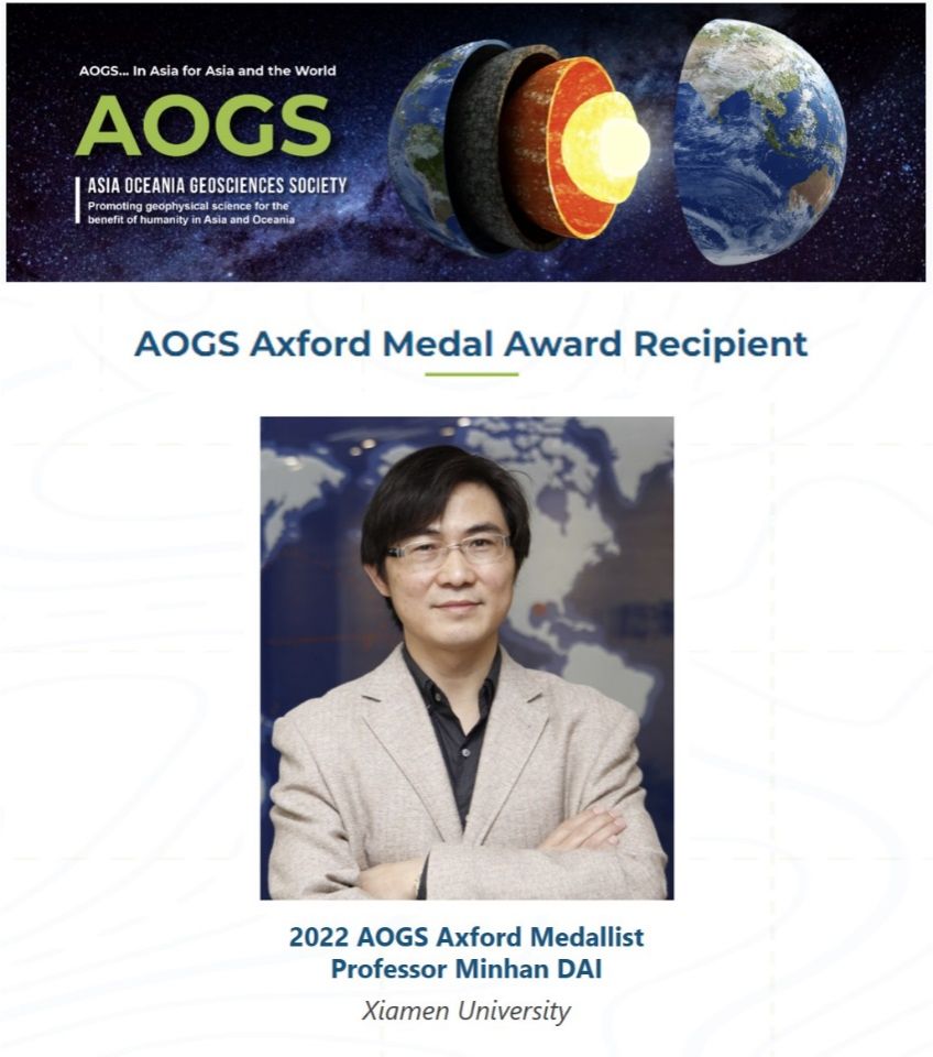 2022年6月15日,亚洲-大洋洲地球科学学会(Asia Oceania Geosciences Society, AOGS)公布了“艾克斯福特奖”(Axford Medal)2022年度获奖人选,我课题组戴民汉教授荣获该奖项。