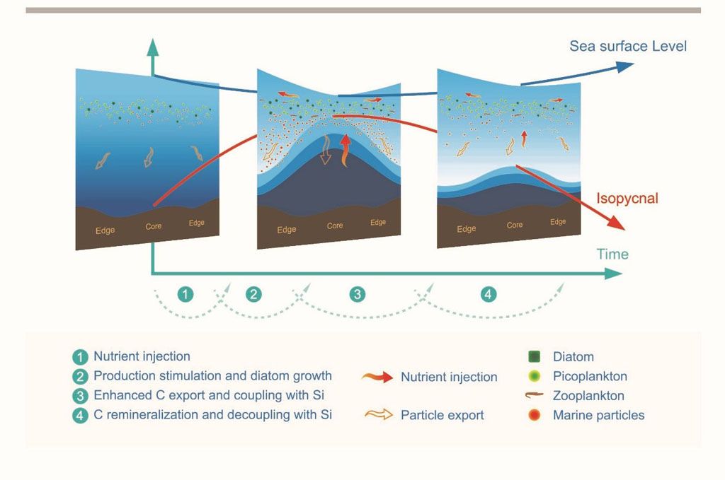 众所周知,亚热带海洋的初级生产力在很大程度上受到层化作用导致的低营养盐供应的限制。中尺度涡旋能加强上层海洋的垂直混合、增强垂直方向上营养盐输运,从而影响亚热带海洋的生物地球化学。然而,当前对中尺度涡旋的生态系统与生物地球化学响应的观测结果却不尽相同,而造成这些观测上差异的主导机制又难以确定。中尺度涡旋的生物地球化学响应很大程度上取决于亚中尺度的变化、涡旋动力过程的时间演变以及涡旋在海洋中的传播,而亚中尺度和涡旋时间演变的现场观测仍然十分有限。