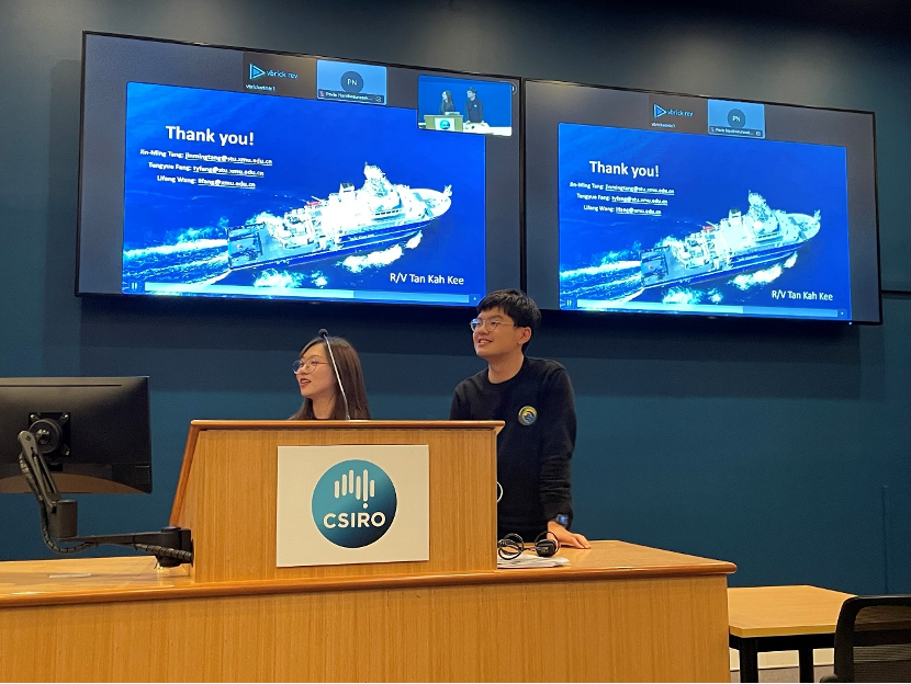 在实验之余,团队成员不忘与其他实验室交流,了解和学习各国使用AA3测定海水营养盐的异同与经验,向同行介绍自主研发仪器iSEA的设计理念和操作方法,就如何继续提升仪器进行了深入探讨,并在航次中通过全球直播介绍了iSEA。航次结束后,师生们参加了CSIRO组织的大洋及近岸海水营养盐专题研讨会,介绍MEL在海洋生物地球化学方面的最新研究,分享了MEL仪器自主研发工作的相关进展。